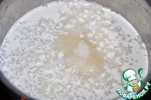 В полуготовый рис добавляем сливки и сахар, перемешиваем.