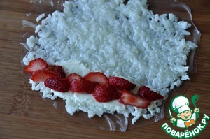 Клубнику моем, режем на кусочки и кладём сверху сыра. -