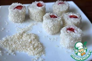 Берём кокосовую стружку и обваливаем в ней роллы.