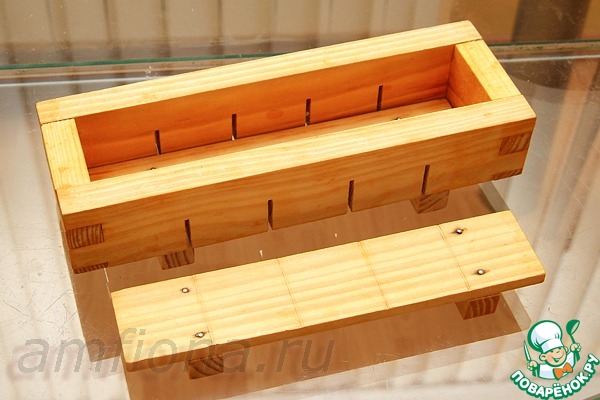 Для прессованных суши понадобится специальный давильный ящик оси-бако, который можно приобрести в специализированных магазинах продуктов для суши.