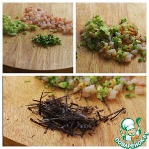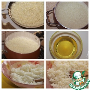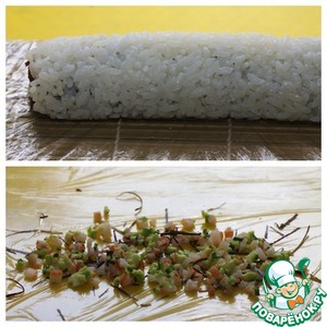 Рис для роллов приготовила по этому рецепту: http://www.povarenok .ru/recipes/show/861 21/. Заправку делала в таком соотношении: к 2-м стаканам сырого риса добавить 5 столовых ложек рисового уксуса, 2 чайные ложки сахара и 1/2 чайной ложки соли. Нам потребуется 250-300 г подготовленного отварного риса с заправкой из рисового уксуса, сахара и соли.