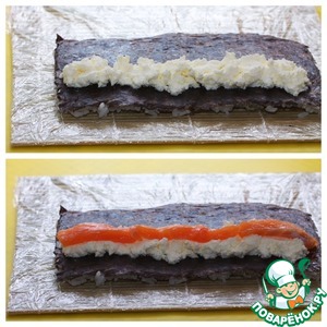 Лист нори разрезать пополам, влажными руками выложить рис на отрезанную 1/2 часть листа. Перевернуть. По центру расположить начинку из сливочного сыра, рыбы, нарезанной брусками.