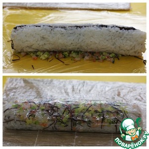 Скрутить ролл круглой формы. Выложить на пищевую пленку стружку нори, смесь креветки, авокадо и огурца.