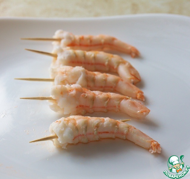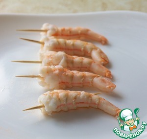 Очищенные креветки на шпажках бросить в кипящую подсоленную воду с долькой лимона. Как только вода снова закипит, переложить креветки в холодную воду на пару минут, затем выложить на блюдо.