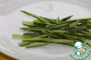 Нарезать тонкой соломкой ленту из огурца, сердцевину с семенами не использовать.
