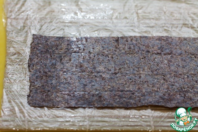 Нарезать ролл на 8 равных частей (1 порция). Снять пленку, посыпать семенами кунжута.