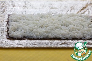 Рис для роллов приготовила по этому рецепту: http://www.povarenok .ru/recipes/show/861 21/. Заправку делала в таком соотношении: к 2-м стаканам сырого риса добавить 5 столовых ложек рисового уксуса, 2 чайные ложки сахара и 1/2 чайной ложки соли. Нам потребуется 250-300 г подготовленного отварного риса с заправкой из рисового уксуса, сахара и соли (зависит от диаметра рисовой бумаги).