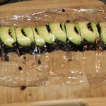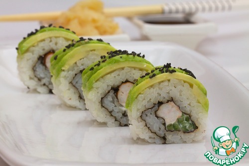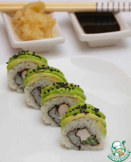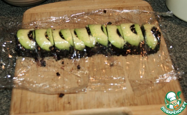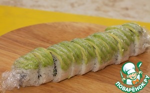 Скрутить ролл круглой формы с помощью бамбуковой циновки (предварительно обернув ее пищевой пленкой!). Выложить ломтики авокадо внахлест по всей длине ролла. Завернуть ролл с авокадо в пищевую пленку.