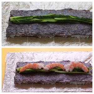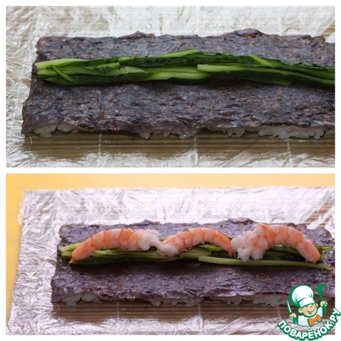 По центру выложить начинку: огурцы и очищенные креветки. Если вы любите поострее, то на лист нори можно нанести пасту васаби.