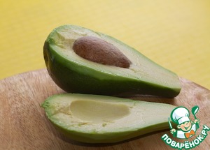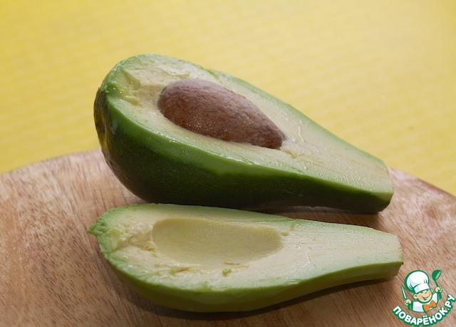 Очистить авокадо от кожуры, разрезать пополам, вынуть косточку. Половину нарезать тонкими ломтиками.
