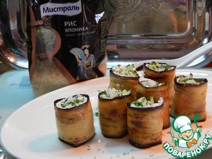 Из риса формируем шарики и выкладываем на одну сторону баклажана. Сворачиваем в рулет.