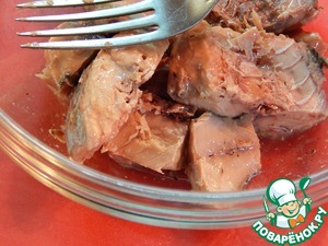 Кусочки тунца (сок сливаем) разминаем вилкой.