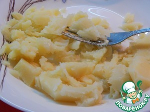 В кулечек сверху выкладываем картофельно-рыбную смесь.