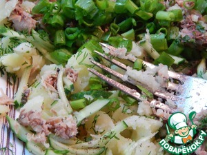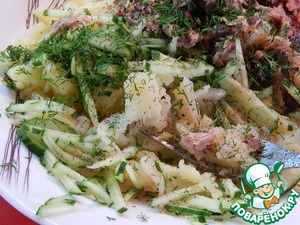 В миске смешиваем картофель, рыбу, натертый соломкой огурец. Солим и перчим по вкусу.