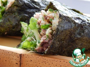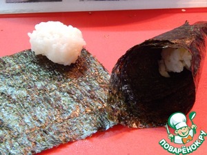 Нори разрезаем пополам. На каждый лист выкладываем шарик из риса и заворачиваем кулечек.