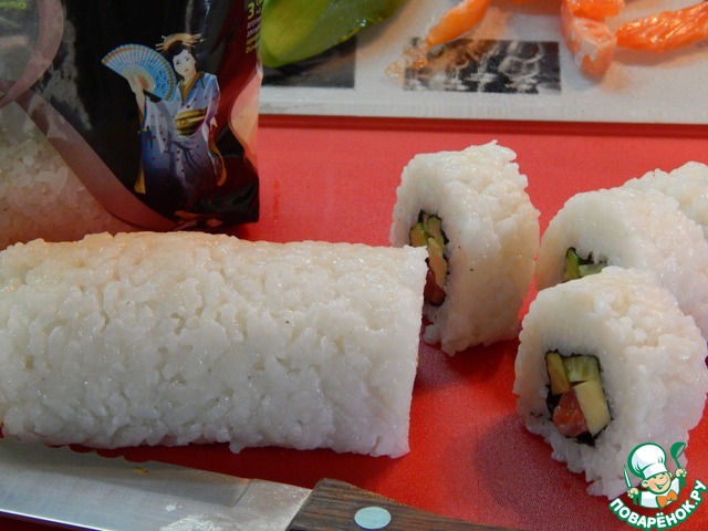 Очень вкусные роллы. В этом рецепте используем рис Японика, который отлично склеивается, за счет чего, роллы хорошо держат форму, несмотря на то, что нори (морская капуста) находится не сверху ролла, а внутри.