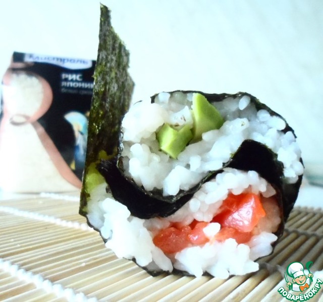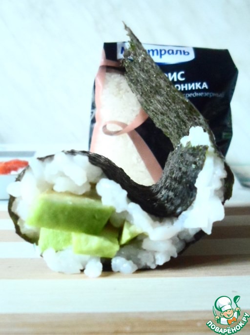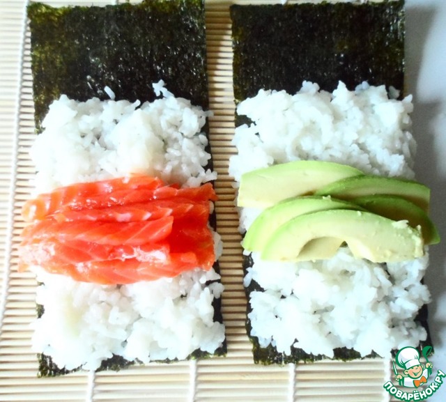 На один лист с рисом положите порезанную полосочками семгу, на другой - порезанный авокадо.