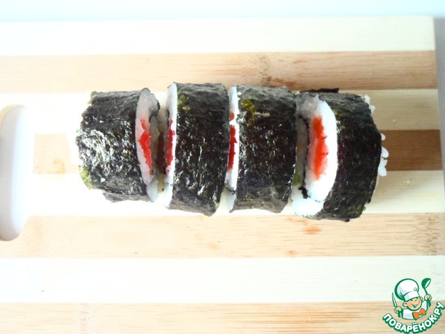 Острым ножом, слегка смоченным в воде, разрежьте ролл сначала пополам, затем каждую часть еще раз пополам.