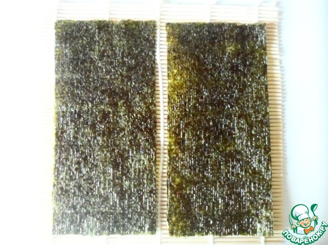 Теперь при помощи бамбуковой циновки нужно свернуть каждый лист нори, придавая форму запятой. При этом край нори без риса остается свободным.