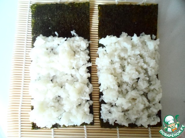 Слегка смочите руки водой и выложите рис на каждый лист нори, оставляя свободной примерно треть листа. Рис выкладывайте не толстым слоем, слегка приминая его.