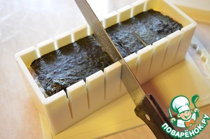 Лист нори выложить в форму для роллов блестящей сторонй вниз. Распределить красную рыбу-кижуч равномерно по поверхности нори.