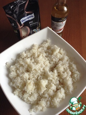 Готовый рис приправляем рисовым уксусом для суши. Приправляем по вкусу. На один стакан отварного риса примерно 1 ч. л. уксуса. Пробуйте по своему вкусу. -