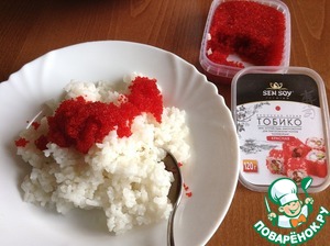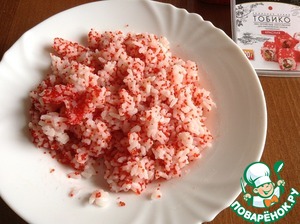 Берем часть риса и окрашиваем его - добавляем в него икру летучей рыбы.