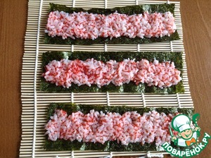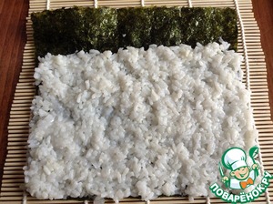 Возьмите длинный лист нори и распределите по нему приготовленный рис для суши, не доходя до края с одной стороны примерно 1,5-5 см.