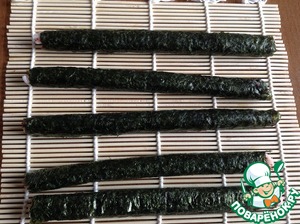 Берем лист нори и разрезаем его вдоль на три равные части.