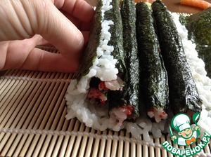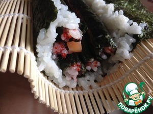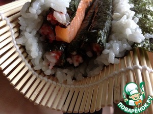 Держа циновку в левой руке, правой поправляете "листочки" цветка, смотрите, чтобы лосось лег ровно в середину и был равномерно "объят" лепестками.