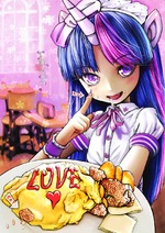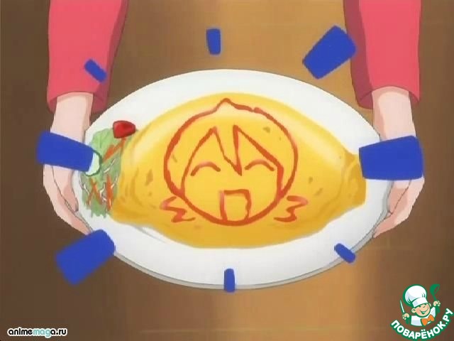 В Японии омурайсу давно стал символическим блюдом. Его готовят в знак признательности конкретному человеку. Поэтому омурайсу – это своеобразное кулинарное послание. Сверху омлета кетчупом обязательно рисуют какие-либо узоры или делают надписи. Кстати, рецепт этого блюда японцы настолько разнообразили, что существуют даже специализирующиеся на его приготовлении кафе, где делают омурайсу со всевозможными начинками и добавками, сохраняя неизменными лишь два ингредиента – рис и омлет. На фото кадр из аниме.