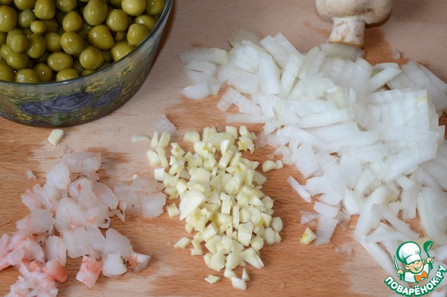 Пока рис варится, приготовим начинку для омлета. Лук и чеснок мелко нарезать. Креветки нарезать небольшими кусочками.