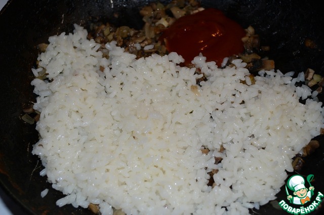 Добавляем приготовленный рис, кетчуп и перемешиваем. Перчим, солим. Немного прогреваем.