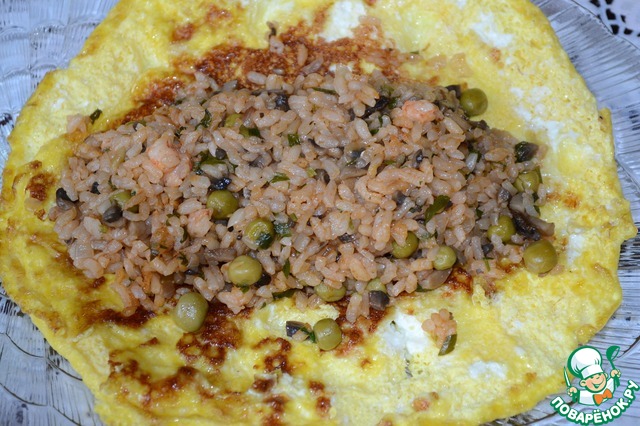 На готовый омлет выкладываем половину рисовой начинки и как бы обворачиваем ее омлетом.
