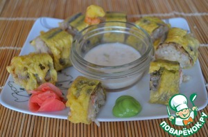 А можем ролл обмакнуть в кляр и обжарить. Кляр делаем из 1 яйца, 50мл воды и примерно 5-6 ст. л. муки. Кляр должен быть немного густым, чтобы тесто не стекало с роллов.