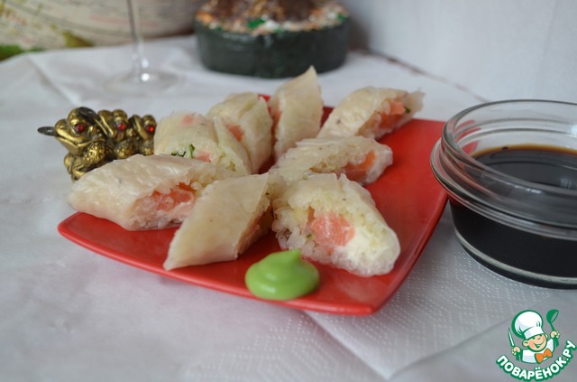 А можем на рыбку положить уже готовый ролл с рисовой бумагой и рыбой внутри. Отлично будлет смотреться, если рыба внутри будет красная, а снаружи-темная.