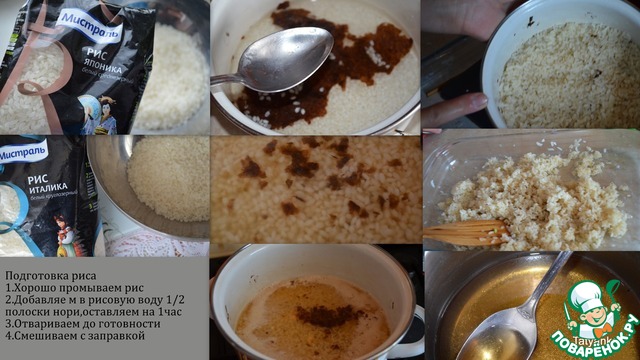 Стандартное приготовление риса заключается в том, чтобы сначала хорошо промыть его в нескольких водах до прозрачности воды (в холодной воде), обсушить примерно 1час на полотенце и отварить в воде в соотношении 1:2. Но мы сегодня сделаем с вами ароматный рис с водорослью нори. После просушки рис заливаем водой в соотношении1 к 2м, добавляем половинку водоросли нори, саке и ставим еще на час постоять. После этого, удалите водоросли, насколько это возможно и отварите до готовности. Дайте постоять 15мин. и горячим смешайте с заправкой для риса ( 35г. яблочного уксуса,0,5 ст. л. меда и 0,5 ст. л. соли). При этом, старайтесь интенсивно мешать рис и обмахивать его руками, веером, чтобы он быстрее остыл. -