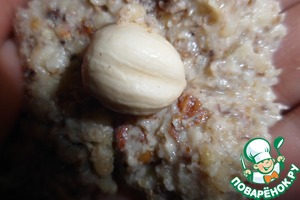 3. Делим на 9 частей. Из каждой части делаем лепешечку, в середину кладем ядрышко фундука и скатываем шарик.