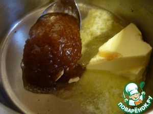 Для соуса сливочное масло и мед нагреваем вместе, помешивая венчиком. При нагревании 2 этих продукта отлично соединяются друг с другом. Как только все смешалось - соус готов.