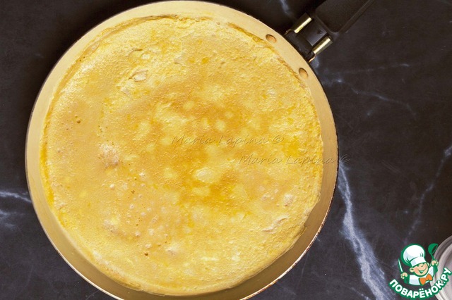 На раскаленную сковороду добавить масло и вылить смесь для омлета. Готовить на среднем огне пока он полностью не схватиться. Нет необходимости его переворачивать, потому что он очень тонкий и успевает приготовиться.