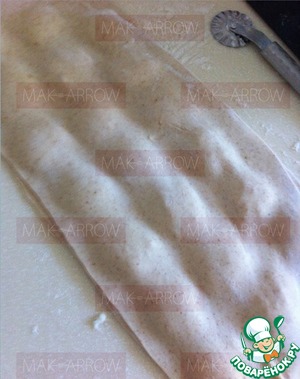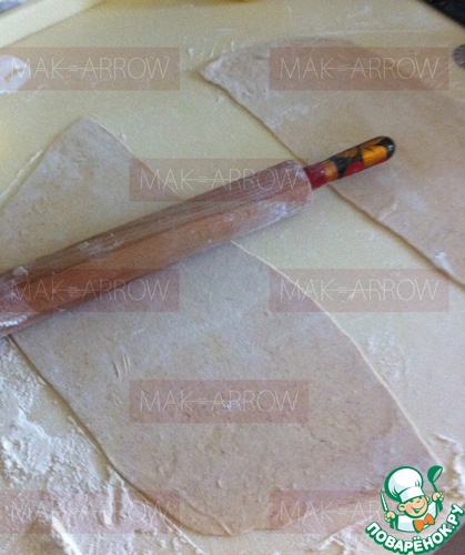 Затем раскатываем наше тесто на столе (лучше конечно в виде прямоугольника) и делим его на две равные половины.