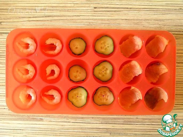 Для удобства приготовления я использовала специальную форму суши-пресс*. Форму ополоснуть водой, на дно каждой ячейки выложить выбранную Вами начинку (у меня креветки, ломтики горбуши и огурец). *Если у Вас нет специальной формы, скатайте рисовые шарики (треугольнички или овалы) и положите сверху выбранную Вами начинку. А еще можно воспользоваться силиконовыми формочками для льда.