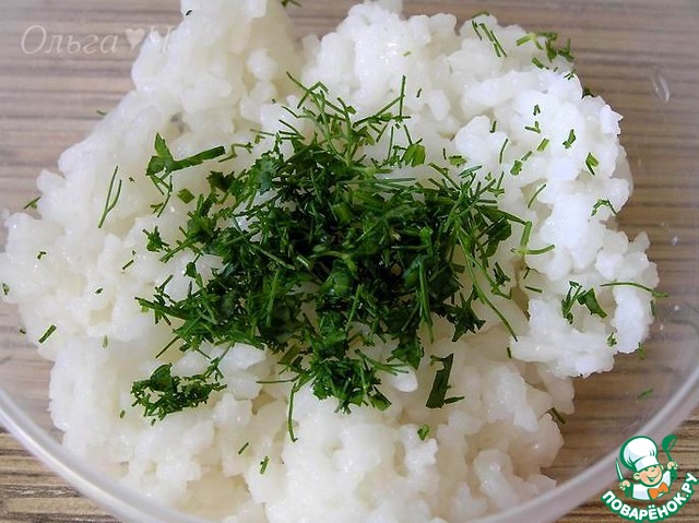 Отложить 1/3 риса и смешать его с рубленной зеленью.