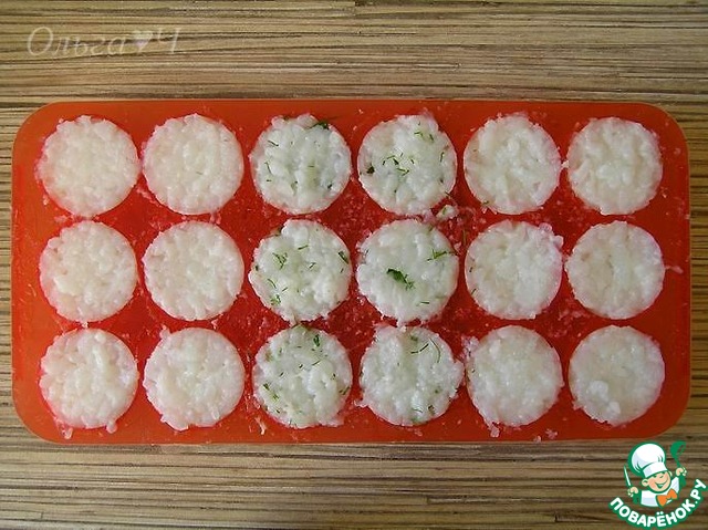 Ячейки с креветками и горбушей заполнить обычным подготовленным рисом. Ячейки с огурцом заполнить подготовленным рисом с зеленью. Слегка утрамбовать. Убрать в морозилку на 1 минуту.
