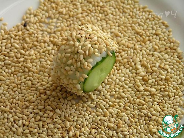 Извлечь приготовленные суши перевернув форму, и надавив сверху на каждую из ячеек. Суши с огурцом обвалять в кунжуте.