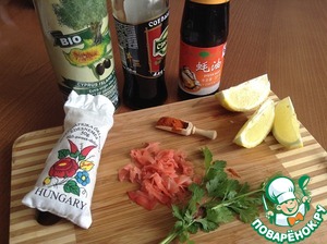 Смешиваем соевый соус, оливковое масло, зелень кинзы, нарезанный маринованный имбирь, раздавленный зубчик чеснока, лимонный сок, паприку. Пробуем на свой вкус. Мне захотелось добавить сладкого вкуса и я налила устричный соус, если у вас его нет, добавьте коричневый сахар - пол чайной ложечки, но это не обязательно, может на ваш вкус будет всего достаточно. -