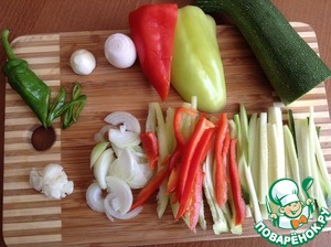 Шинкуем соломкой болгарский перец, цуккини, лук, перец чили., зубчик чеснока раздавливаем.