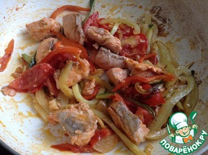 На растительном масле обжариваем овощи, добавляем рыбу.
