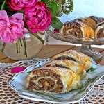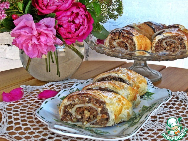 Чуть раскатываем слоеное бездрожжевое тесто, укладываем начинку. У меня из этой порции теста и начинки получается то 3 то 4 рулета. Все зависит от того, сколько я кладу начинки. К тому же, я заворачиваю начинку в тесто несколько раз. Вы можете поступать по своему усмотрению.