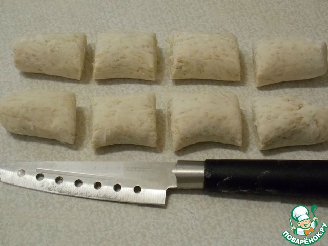 Через час достаем наше отдохнувшее тесто. Стол присыпать мукой. Тесто для удобства разделить на две равные части и скатать из них колбаски диаметром в 2 см. Разрежьте каждую на 4 части.